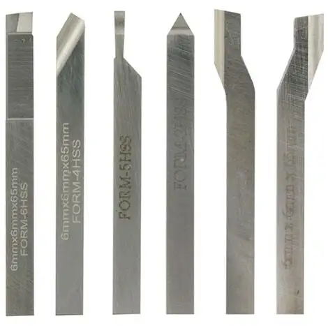 Outil de creusage, dégrossissage, outil de tronçonnage, outil de finition, outil à charioter coudé droit et outil à charioter coudé gauche.