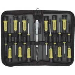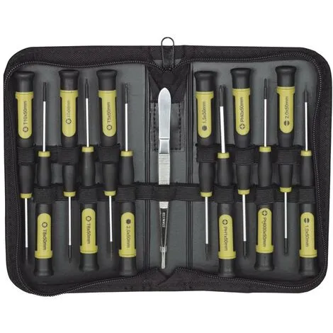 - 1 micro-tournevis chacun : fente : 1 x 50 – 2 x 50, cruciforme : PH 000 x 50 – PH 0 x 50 – PH 1 x 50, TX : 5 x 50 – 6 x 50 – 7 x 50 – 8 x 50 – 10 x 50, HX : 1,5 x 50 – 2 x 50, 1 étui de rangement